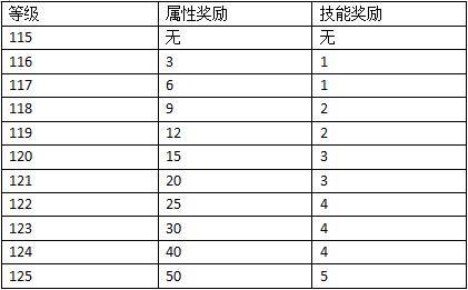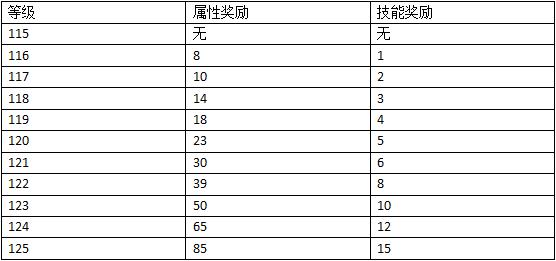 当角色等级到达115以上时,就可以得到光荣的导师称号,并获得转生的机会,转生之后将失去之前所累积的经验、属性及技能,但是在接下来每次升级却可以获得更多的属性和技能奖励点数,还可以使用转生后专用的防具以及新成长武器的终极能力,这样实力的提升也代表着会面临到更多艰难的挑战,当然也会获得世上所有冒险者的尊敬。导师奖励点数当等级达到115以上成为导师后,在115到125之间转生后的的属性、技能奖励会有以下的变化。