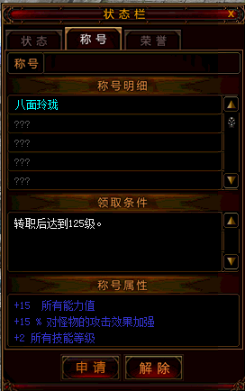 小号没装备的话可以在世界频道喊下,一般都有高等级玩家带,进冰女地图2层记得点重复接任务,一天一次,最好做6天,在这6天正好打钱买把超变,都一切准备好了,就在玩家店铺那买把去圣堂的钥匙,先去灵隐村找普通NPC进入海底,再进入圣堂,最好变身后进入,防止一进去被秒杀,进去后建议吃10倍经验卷轴,开始练级,切忌一点超变只有10分钟的时间,变身结束前记得提前去2楼角落,超变变身结束后,可以在商城购买成长的时钟,对超变使用,就又可以变身了,如果游戏金钱较多,想节约时钟,就多买几把,一个一个变身,这样练不久就125级可以进行2转了,切忌2转前必须练到125级, 125级会给一个称号“八面玲珑”,属性加成较多。