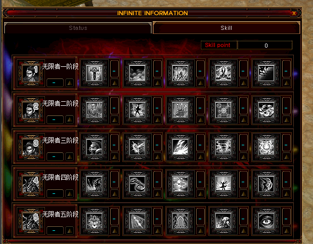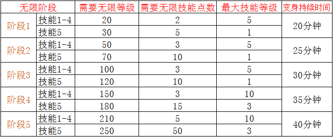 无限者变身包括5个阶段,对应的变身时间为比当前阶段高的阶段技能是看不到的。